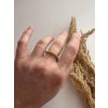Jemný, sofistikovaný a ručně vyráběný! Tento prstýnek je tvořen broušenými skleněnými korálky o velikosti 3 mm v nádherném béžovém odstínu, které se krásně lesknou při dopadu světla. Doplňuje je jeden zlatý kovový korálek bez obsahu niklu, který dodává šperku luxusní nádech. Prstýnek je navlečen na pružné gumičce, díky čemuž se přizpůsobí velikosti prstu a pohodlně se nosí.