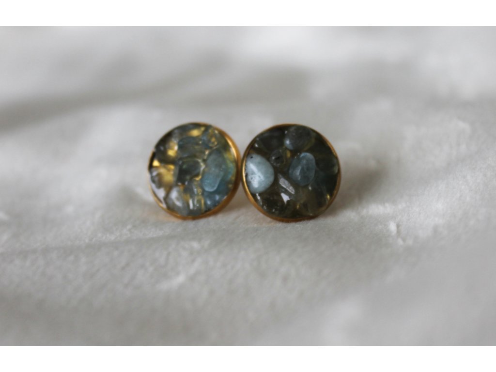 Tyto jemné náušnice v sobě nesou klid a svěžest – přírodní akvamarín je zasazený v elegantním pozlaceném lůžku z chirurgické oceli. Každý kamínek má svůj vlastní odstín a strukturu, takže žádný pár není stejný.
